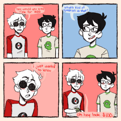 > waaay more vain than people expect. he'll still look stupid for a joke or to prove a point or whatever, but he has a strong interest in fashion due to spending a lot of time with kanaya on the meteor (and also just liking it on his own time).